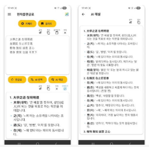 또한 AI 기반 번역 엔진을 사용해 정확도를 높이고 한자와 한글을 동시에 비교해 보여주는 UI를 제공해 초보 학습자도 쉽게 의미를 이해할 수 있도록 도와줍니다.