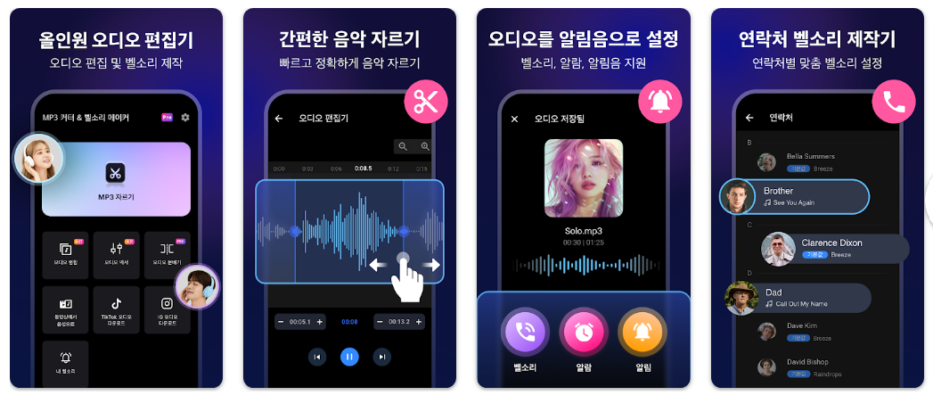 이 어플리케이션은 음악 편집과 벨소리 제작에 특화된 전문 오디오 도구입니다. MP3 커터 기능을 사용하여 곡의 하이라이트를 추출하고 이를 벨소리, 알람, 통지음으로 즉시 할당할 수 있는 편의성을 제공합니다.