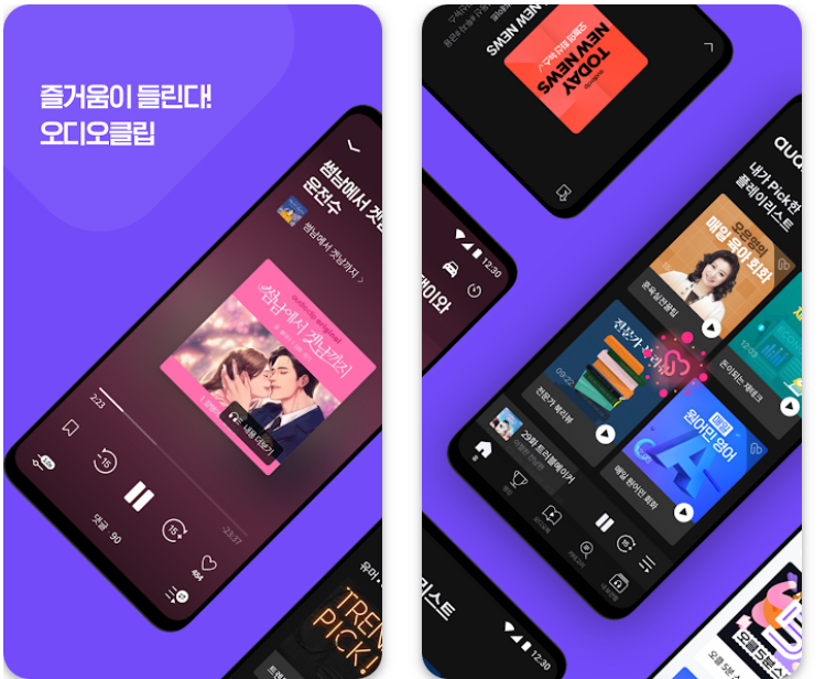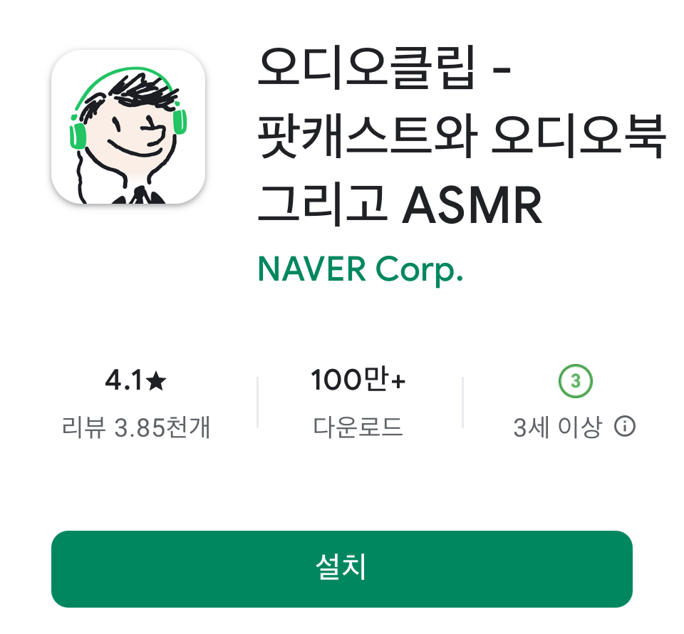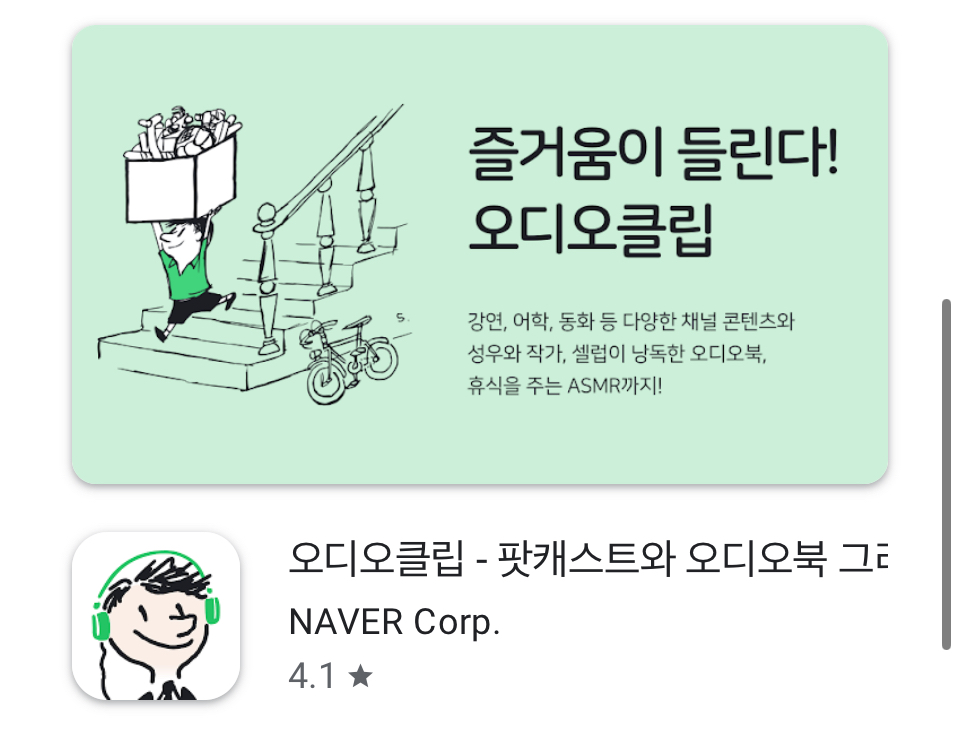 • 안드로이드: 구글 플레이스토어에서 ‘오디오클립’을 검색 후 설치할 수 있습니다. 현재 100만 회 이상 다운로드 되었으며 평점은 약 4.4입니다.