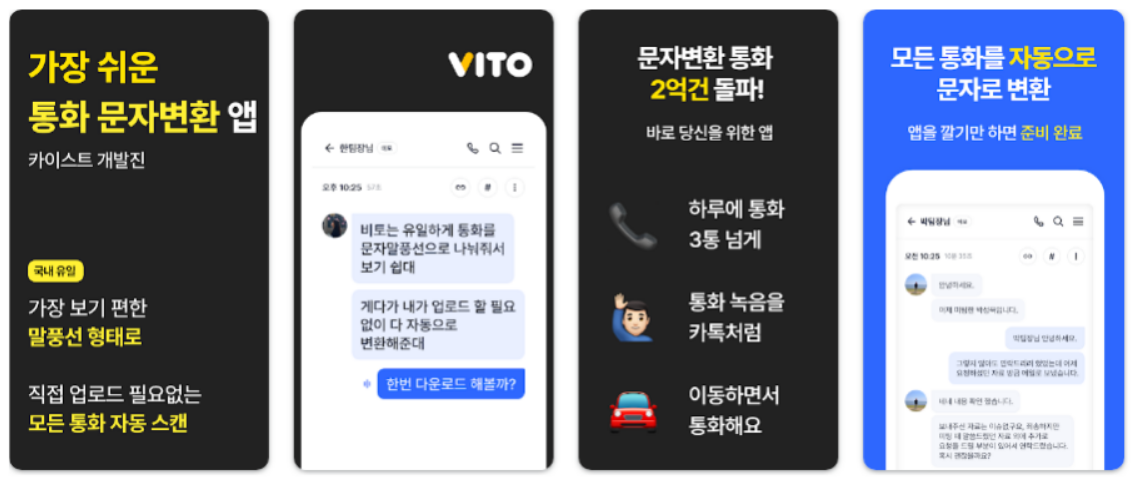 ‘비토(VITO)’는 통화 녹음뿐 아니라 녹음된 내용을 인공지능이 자동으로 문자로 변환해 주는 혁신적인 앱입니다. 통화 후 녹음 파일을 직접 들을 필요 없이, AI가 대화 내용을 요약해 텍스트로 제공해 줍니다.