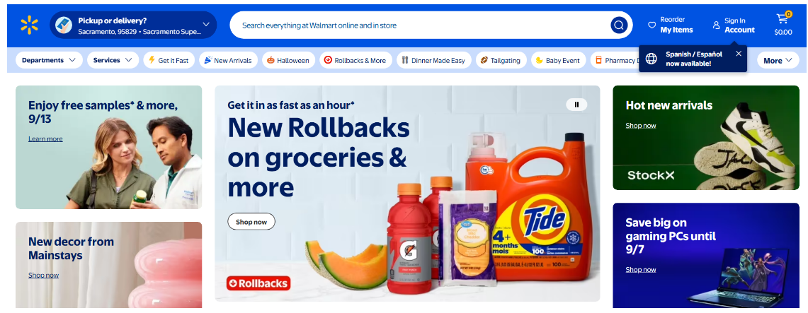 Walmart는 미국의 대표적인 대형 유통업체로, 온라인 쇼핑몰을 통해 식료품, 가전제품, 의류, 생활용품 등 다양한 상품을 제공합니다. 합리적인 가격과 폭넓은 상품군으로 많은 소비자에게 인기가 높은 플랫폼입니다.