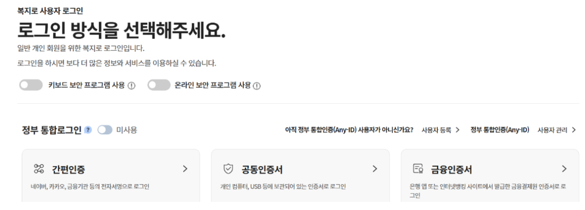 - 접속 환경 확보 : 공동·금융인증서 로그인이나 간편인증 시 보안 프로그램 설치가 필요할 수 있습니다.