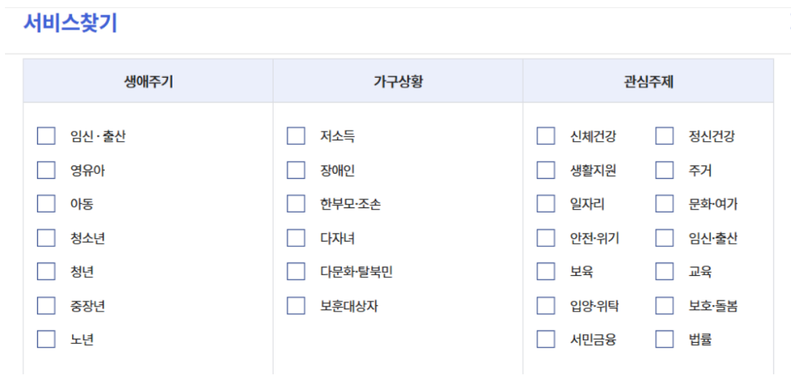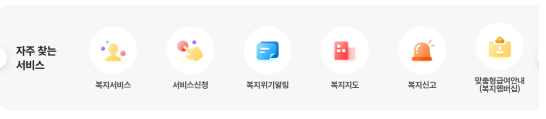 - 서비스 검색 : 상단 메뉴 중 ‘복지서비스 신청’ 또는 ‘서비스 찾기’ 기능을 통해 지원 대상 및 종류를 조회합니다.