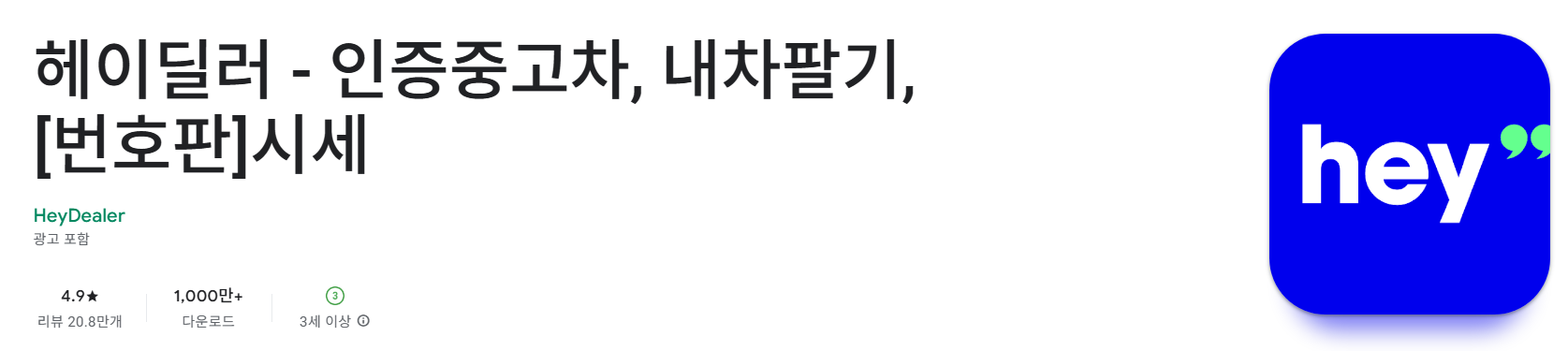 먼저 스마트폰에서 구글 플레이스토어나 앱스토어에 접속한 뒤 ‘헤이딜러’를 검색합니다. 검색 결과에서 앱을 선택한 후 설치 버튼을 누르면 간단하게 다운로드가 완료됩니다.